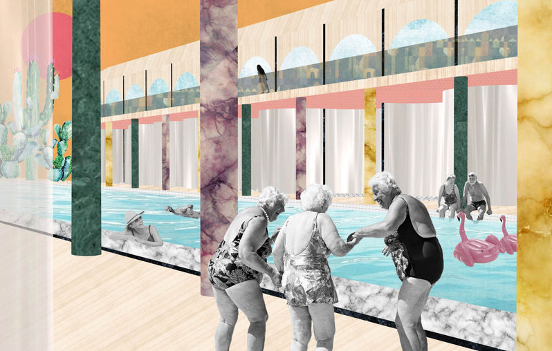 In September 2018, twelve students came together to form the Recreation Agency: a non-governmental body tasked with re-imagining Gateway Park (a vast plot of land at the base of the Oakland Bay Bridge) and the future of leisure. This project re-conceptualizes the apartment unit as a venue for recreation. As mobility and energy levels decrease with age, seniors often find themselves confined to home. Students and young professionals, burnt out from school and work, also sometimes choose to “stay in” as opposed to “go out”. Turns out young and old have something in common. All units are two-stories high with senior bedrooms on the first floor, student bedrooms upstairs, and a spacious double height living space tying the two together.